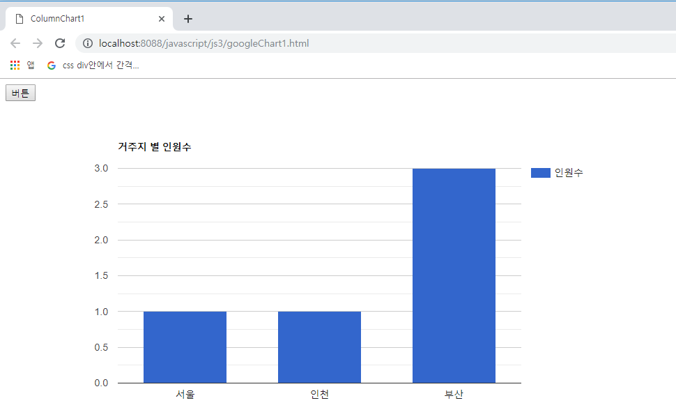 // 버튼 동작 $(document).ready(function(){ $('button').on('click', function(){ $.ajax({ url:'columnChart1.jsp', success:function(result){ columnChart1(result); } }); }); }); </script> </head> <body> <button type="button" id="btn">버튼</button> <div id="column_chart_div1" style="width: 900px; height: 500px;"></div> </body> </html> |