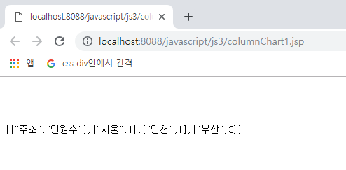 JSONArray colNameArray = new JSONArray(); // 컬 타이틀 설정 colNameArray.add("주소"); colNameArray.add("인원수"); jsonArray.add(colNameArray);