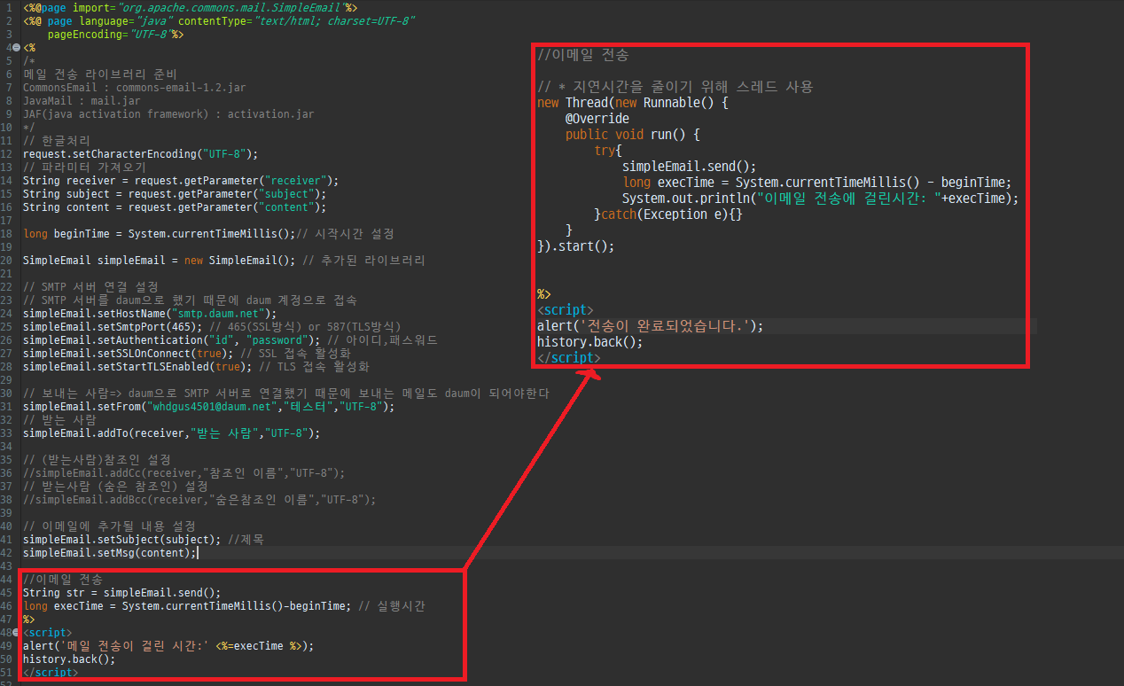 //이메일 전송 String str = simpleEmail.send(); long execTime = System.currentTimeMillis()-beginTime; // 실행시간 %> <script> alert('메일 전송이 걸린 시간:' <%=execTime %>); history.back(); </script> |