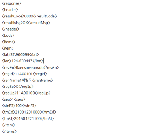 // parsing tag NodeList nodeList = doc.getElementsByTagName("item"); System.out.println("파싱할 리스트 수 : "+ nodeList.getLength()); for(int temp =0; temp<nodeList.getLength(); temp++) { Node nNode = nodeList.item(temp); if(nNode.getNodeType()==Node.ELEMENT_NODE) { Element element = (Element) nNode; System.out.println("##########################"); System.out.println("위도: "+getTagValue("lat", element)); System.out.println("경도: "+getTagValue("lon", element)); System.out.println("예보구역명(영문): "+getTagValue("regEn", element)); System.out.println("예보구역코드: "+getTagValue("regId", element)); System.out.println("예보구역명(한글): "+getTagValue("regName", element)); System.out.println("지역특성: "+getTagValue("regSp", element)); System.out.println("상위구역코드: "+getTagValue("regUp", element)); System.out.println("순번: "+getTagValue("seq", element)); System.out.println("3시간예보관서: "+getTagValue("stnF3", element)); System.out.println("종료시각: "+getTagValue("tmEd", element)); System.out.println("시작시각: "+getTagValue("tmSt", element)); }//if }//for page += 1; if(page >12) { break; } }//while } catch (Exception e) { e.printStackTrace(); } }//main }